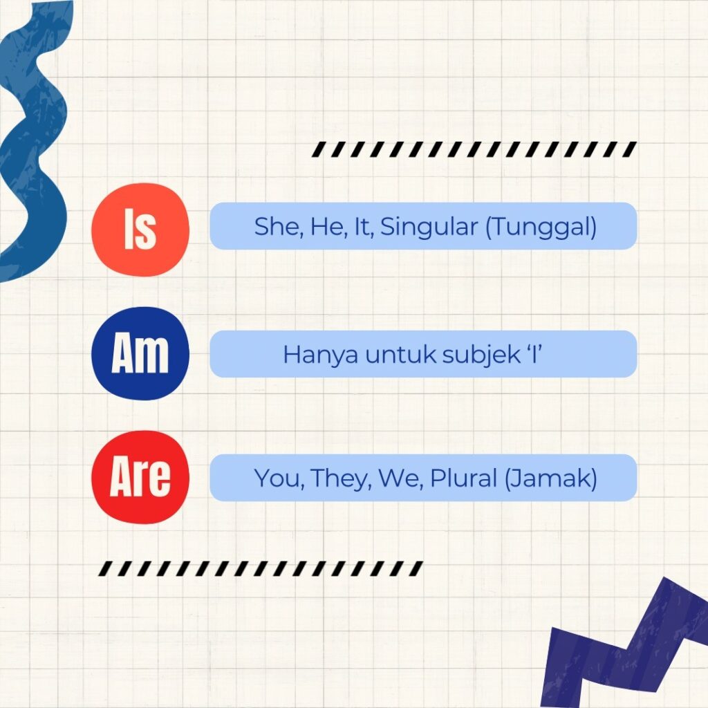 Rumus Present Continuous Tense butuh auxiliary verbs yaitu is, am, are. Menentukan jenis kata kerja bantu harus memerhatikan Subjeknya terlebih dahulu.